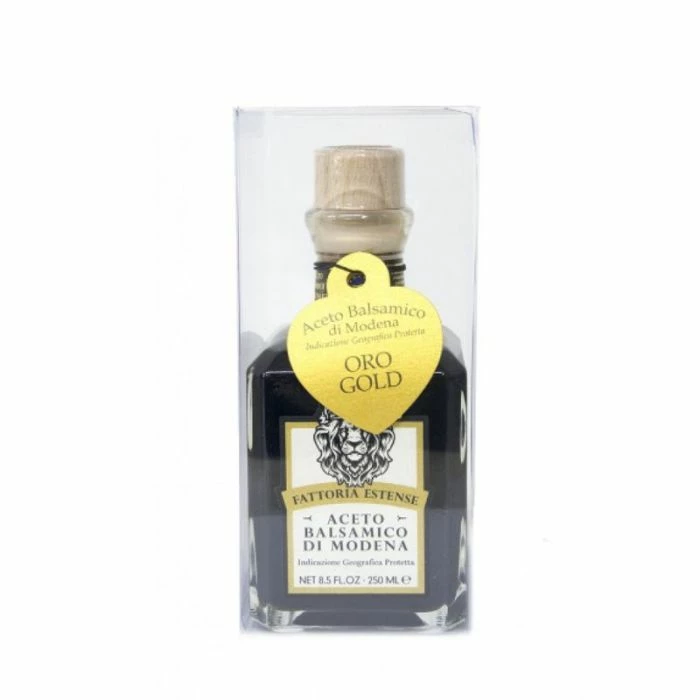L’aceto balsamico di Modena IGP Oro Fattoria Estense, è un prodotto selezionato invecchiato in botte, rappresenta la qualità invecchiata per almeno 3 anni in botte di rovere, infatti per vantare della certificazione invecchiato il minimo affinamento in legno sono 3 anni. Prodotta dall’acetificio Alico vanta della denominazione IGP. L’aceto balsamico Oro è un prodotto d’eccellenza si presenta vellutato, di medio alta corposità colore tipico dell’aceto balsamico affinato in botte.