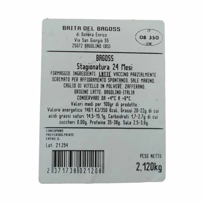 Il Bagoss è un formaggio semigrasso a pasta extra dura. Il nome deriva dagli abitanti di Bagolino comune in provincia di Brescia, i Bagossi. Si produce con latte crudo di vacca razza bruno alpina. Durante la rottura della cagliata il casaro aggiunge lo zafferano il quale caratterizza il Bagoss. E’ un formaggio nobile, può raggiungere dimensioni superiori ai 20 kg, durante la stagionatura assume un gusto al piccante, il colore è tendente al giallo. La pasta, dopo la normale stagionatura diventa granulosa e può rompersi. Questo formaggio è un presidio Slow Food.