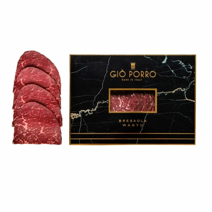 Bresaola Wagyu Giò Porro 70g è un prodotto davvero unico proveniente dal laboratorio di Giò Porro in Valtellina. Questo artigiano ha riscoperto la tradizione della produzione della Bresaola attraverso un metodo chiamato Metodo Zero: un processo produttivo naturale validato dal team di ricercatrici della Stazione Sperimentale delle Conserve Alimentari di Parma. Bresaola Wagyu Giò Porro 70g è prodotta da carni selezionate da tagli unicamente di Punta d’Anca di esemplari Bovini di Razze pregiate Wagyu, le carni vengono salate a mano e massaggiate prima della stagionatura che si protrae per almeno 3 mesi prima della commercializzazione. La Bresaola Wagyu Giò Porro 70g rappresenta il massimo dell’esperienza gustativa ed olfattiva dei prodotti di Gio Porro.
