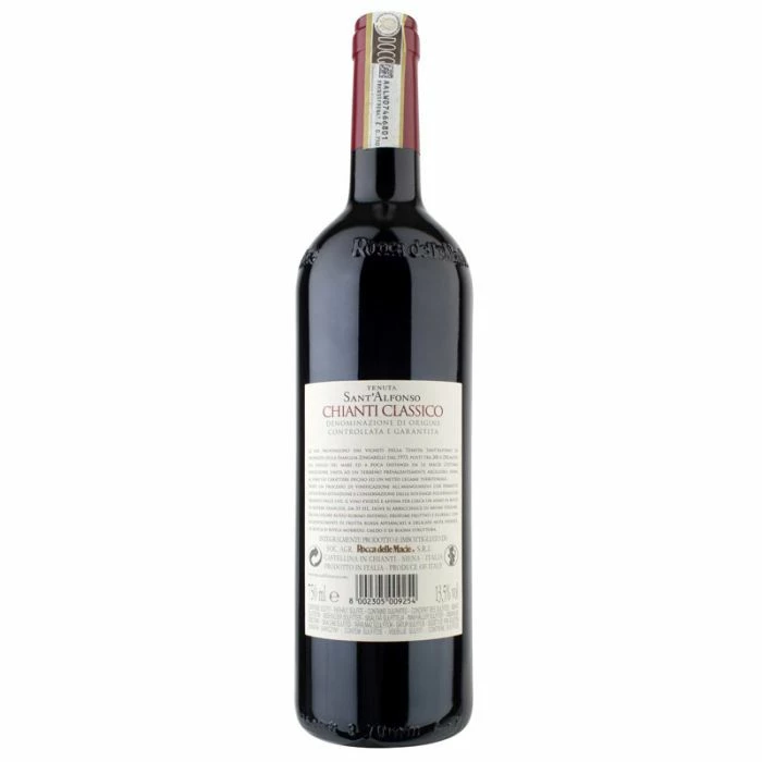 Chianti Classico Tenuta Sant’Alfonso è un vino Chianti ottenuto da sole uve Sangiovese di particolari cloni selezionati dalla cantina Rocca delle Macie che in questa tenuta dalle caratteristiche differenti dal punto di vista della composizione dei suoli danno risultati diversi. Tenuta Sant’Alfonso è un possedimento di Rocca delle Macie su terreni poveri di scheletro e ricchi di argilla che riescono a concorrere alla maturazione del Sangiovese rendendolo più ricco in polifenoli e più strutturato. Il Sangiovese della Tenuta Sant’Alfonso viene raccolto manualmente e portato in cantina per la vinificazione che avviene in contenitori di acciaio inox termocontrollati e il processo fermentativo dura per circa 10 giorni con continui rimontaggi per estrarre i composti coloranti e aromatici dalle bucce al mosto. Successivamente il Chianti Classico Tenuta Sant’Alfonso viene separato dalle bucce e posto in botti di rovere francese per un anno prima dell’assemblaggio, dell’imbottigliamento e del riposo di almeno un anno in bottiglia.