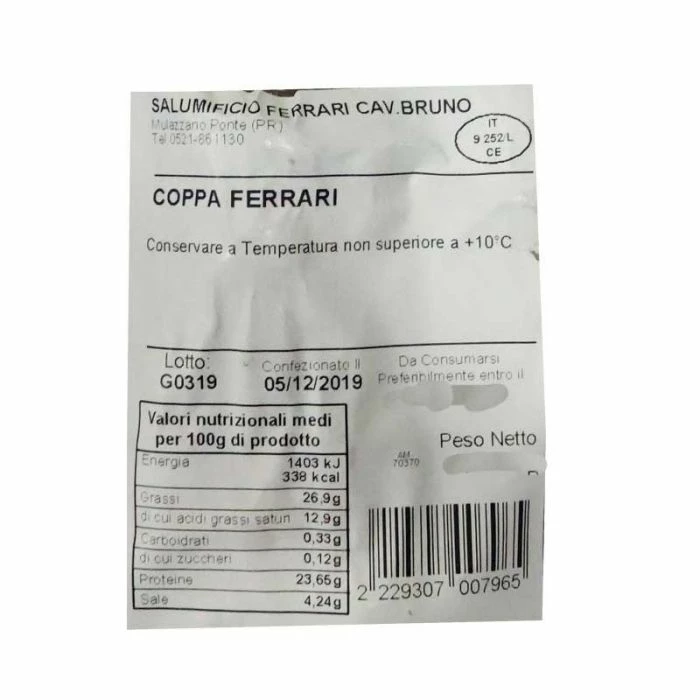 La coppa Ferrari è il fiore all’occhiello dell’azienda parmigiana, viene infatti realizzata quasi interamente a mano. Vengono scelti solo i maiali migliori rigorosamente italiani. Per la produzione della coppa Ferrari, vengono selezionati e sgrassati le parti del muscolo della regione cervicale superiore. il salume si presenta di forma cilindrica, con un peso che può arrivare fino a 2,6 kg al taglio presenta un profumo fragrante ed intenso tipico del salume. L’intensità aromatica e la persistenza al palato aumenta in questo salume con la stagionatura che vada un minimo di 30 giorni a diversi mesi. é ottima consumata con altri salumi tipici parmigiani come il crudo di Parma e il culatello.