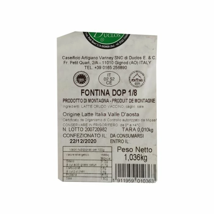 La Fontina è un formaggio valdostano grasso a media lunga stagionatura riconosciuto con il marchio D.O.P. Per la produzione del Fontina viene utilizzato esclusivamente latte di vacca, gli allevamenti da cui deriva il latte sono situati per la maggior parte in alpeggio. Il Fontina D.O.P è un formaggio antico infatti le prime citazioni risalgono al 1477 nella Somma Lactinorum. Il formaggio si presenta di colore arancio marrone, la crosta è sottile con pasta elastica e con la caratteristica occhiatura fine di colore giallo paglierino. Il formaggio Fontina è idoneo alla lunga stagionatura. Mediamente persistente a livello aromatico e delicato al gusto.