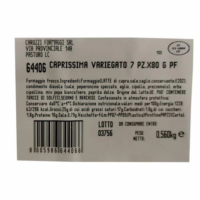 | ingredienti | Latte di capra, caglio liquido (coadiuvante tecnologico),sale,0,4%aromi naturali: erba cipollina, pepermix ( 50%pepe nero,50%pepe bianco)paprica dolce e peperaglio (50%pepe rosso,50%aglio).Con |