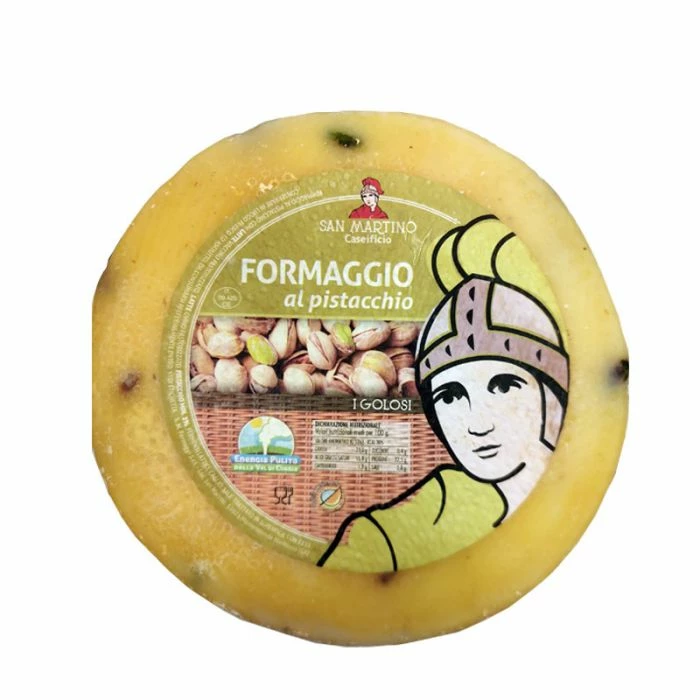 Formaggio al pistacchio del caseificio San Martino è un formaggio toscano prodotto con latte di pecora e latte vaccino con aggiunta di pistacchio intero. Il formaggio si presenta di colore bianco con all’interno pezzi di pistacchio, ha un caratteristico sapore di latte appena munto, con il caratteristico sapore di pistacchio. Questo formaggio è ottimo consumato in purezza accompagnato da un buon vino toscano come la Vernaccia.
