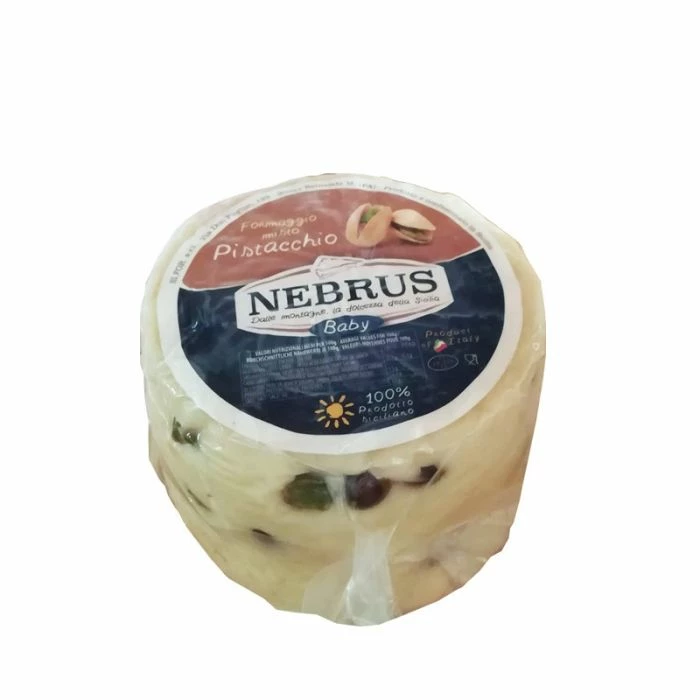 Il formaggio fresco siciliano prodotto con latte di pecora viene aromatizzato con pezzi di pistacchio il quale dona al formaggio Nebrus un sapore unico e irresistibile. Il formaggio ha una breve stagionatura, la pasta si presenta di colore bianco con all’interno dei pezzi pistacchio. Il formaggio fresco siciliano al pistacchio è ottimo consumato come aperitivo o come basi di piatti fantasiosi.