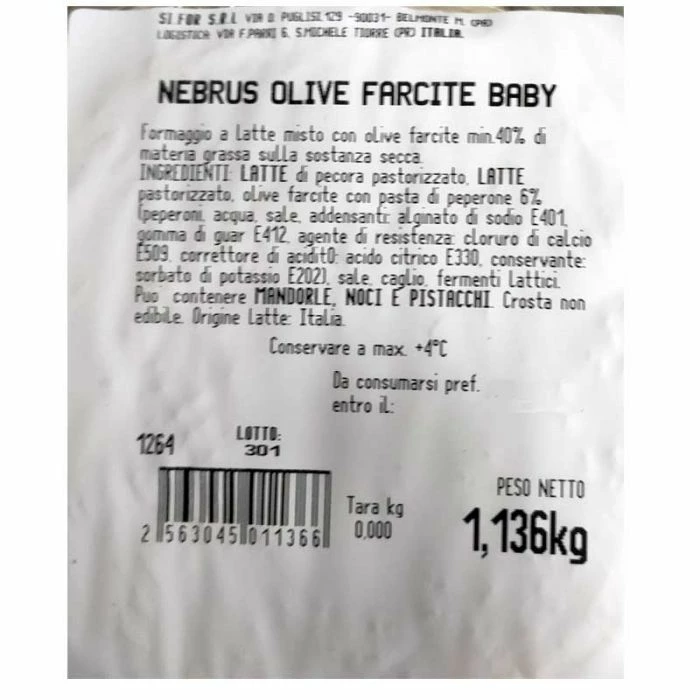 | ingredienti | LATTE di pecora pastorizzato, LATTE pastorizzato, olive farcite con pasta di peperone 6% (pasta di peperone: peperoni, acqua, sale, addensanti: alginato di sodio, gomma di guar. Agente di resistenza: cloruro di calcio. Correttore di acidità: acido citrico. Conservante: sorbato di potassio) sale, caglio, fermenti lattici. Puo’ contenere tracce di frutta a guscio e lupini. |