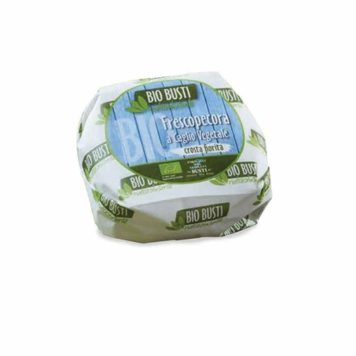 Frescopecora Bio con caglio vegetale Busti è un formaggio toscano prodotto con latte di pura pecora la coagulazione è effettuata tramite del caglio vegetale, questo fa si che questo formaggio è adatto ad un’alimentazione vegetariana. Il formaggio è un prodotto fresco inoculato con muffe nobili selezionate le quali rendono la crosta fiorita, si presenta di colore chiaro ha un caratteristico sapore di latte appena munto, e si presenta morbido e cremoso. Questo formaggio è ottimo consumato in purezza accompagnato da un buon vino rosso toscano di medio corpo o uno trento DOC