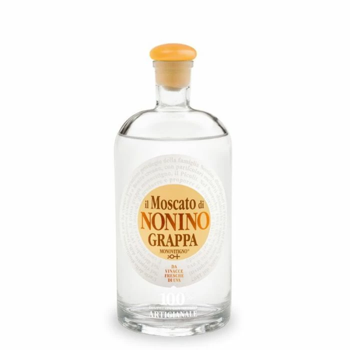 Grappa di Moscato Nonino è ottenuta da vinacce di moscato provenienti dalle zone più vocate, la fermentazione delle vinacce avviene sottovuoto in tini in acciaio inossidabile a temperatura controllata, seguita immediatamente dalla distillazione per evitare fermentazioni secondarie dannose. La distillazione è artigianale e discontinua con il taglio delle teste e delle code.