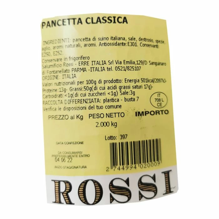 La pancetta stagionata del salumificio Rossi è prodotta con la pancia del suino, con relativa pelle (cotenna), viene rifilata, salata, speziata. Viene arrotolata e legata prima di essere asciugata. Viene poi stagionata per alcuni mesi nelle nostre cantine. Il prodotto ottenuto è una pancetta caratterizzata da un aroma dolce di antica ricetta, grande morbidezza e delicatezza grazie alla venatura di grasso bianco nobile.