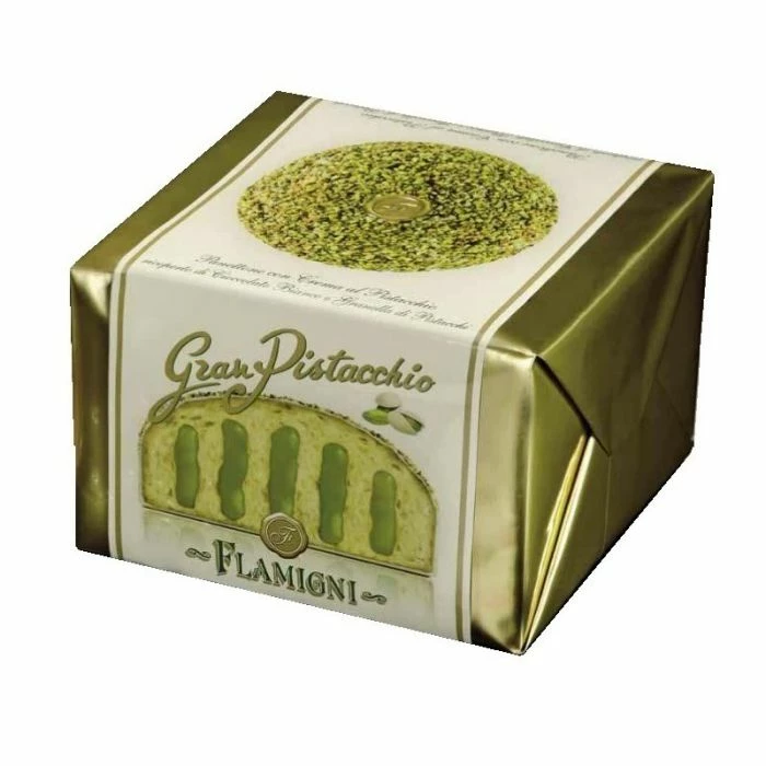 Panettone Flamigni Gran Pistacchio 950 g è un panettone artigianale che viene preparato da Flamigni utilizzanto materie prime di prima qualità e ingredienti naturali. La caratteristica fondamentale di questo panettone è la presenza di selezionati Pistacchi di Bronte e crema di Pistacchio all’interno dell’impasto che conferiscono un gusto particolare ed unico. Il Panettone viene glassato con Crema di Pistacchio senza uva sultanina e agrumi canditi, è un prodotto dolciario da forno a lievitazione naturale, soggetto a calo naturale.