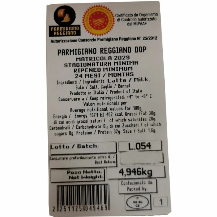 Il Parmigiano Reggiano 24 mesi è considerato il fiore all’occhiello di questa azienda che produce formaggi ormai da più di 60 anni. Infatti il Parmigiano Reggiano raggiunge un equilibrio gustativo molto piacevole alla stagionatura di 24 mesi, conservando caratteristiche di freschezza e pastosità unite a una certa struttura e friabilità La crosta del Parmigiano Reggiano è dura e liscia, è marchiata e caratterizzata della solita pallinatura, la pasta detta grana, è granulosa, medio morbida e non molto friabile di colore paglierino, con occhiatura fine quasi inesistente.