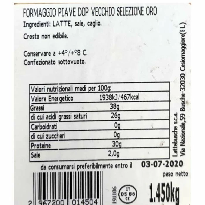 Piave DOP Vecchio Selezione Oro è un formaggio stagionato veneto che prende nome dal fiume che attraversa la vallata il Piave. Il Piave DOP Vecchio Selezione Oro è prodotto con latte di vacca, il latte utilizzato proviene esclusivamente dalle zone di Belluno. Il formaggio si presenta di pasta di colore bianco avorio tendente al giallo paglierino e la crosta tipica dura, ricoperta dal marchio. La stagionatura del Piave DOP Vecchio Selezione Oro è oltre 12 mesi. Ottimo formaggio consumato in purezza o grattugiato, dall’alto valore nutritivo e facilmente digeribile.