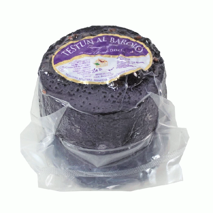 Il Testun al Barolo è un formaggio semigrasso, affinato per più di cento giorni su speciali assi di legno in grotte di tufo. Parte dell’affinamento lo passa a contatto con vinacce di nebbiolo utilizzato per la produzione di Barolo, questo fa si che il Testun oltre al lungo affinamento acquisisca sentori tipici del vino. Questo formaggio è ottimo consumato con un buon vino rosso strutturato, in accompagnamento a una confettura o fichi caramellati. Il Testun al Barolo si presenta con una colorazione violacea data dall’affinamento con le vinacce, la pasta è dura, l’occhiatura fine e poco persistente.